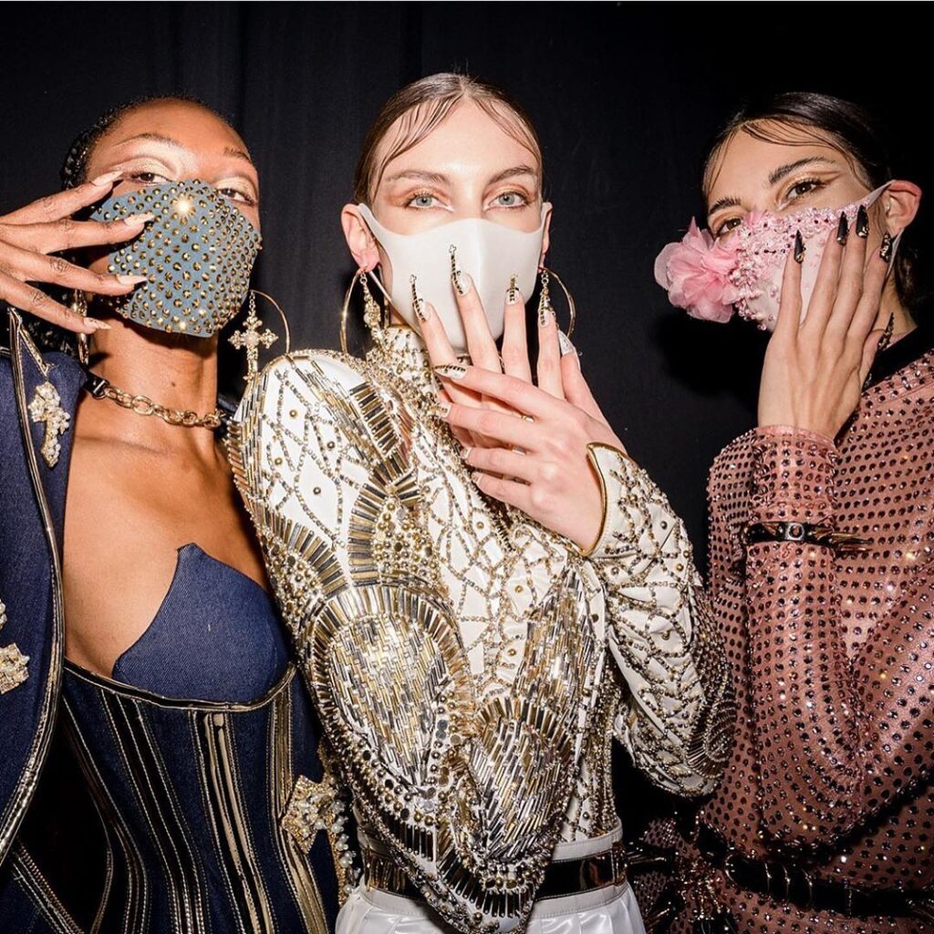 Models wore masks bedazzled in everything from flowers to studs for The Blonds show during New York Fashion Week in February 2020.